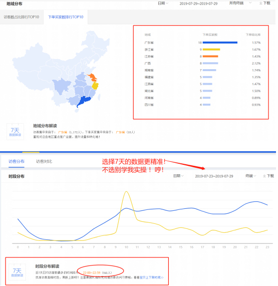 地域和时间,我们都参考生意参谋---流量---访客分析里的数据。一般来说选择7天的数据更为精准哦。